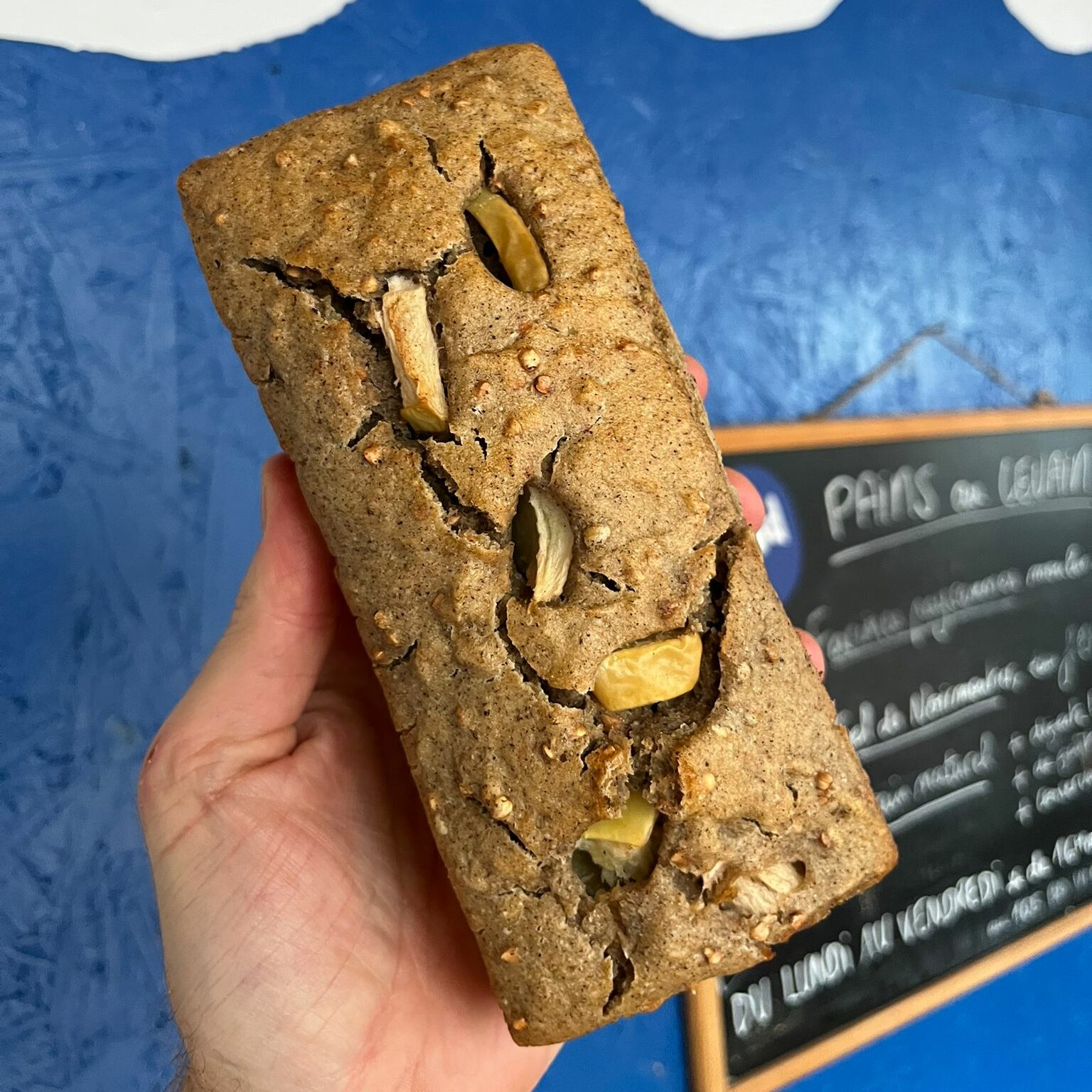 50% farine de sarrasin // 50% farine de blé (T110 moulues sur pierre par Frédéric Eeckhout – Terdeghem), eau filtrée, levain, sel de Noirmoutier, graines de sarrasin et pommes (Entr’Aide Union).